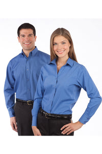 This casual men's poplin feels like a dress shirt. Stands up to demanding wear and is offered in a plethora of colors. Great for restaurants; delivery services or customer service.